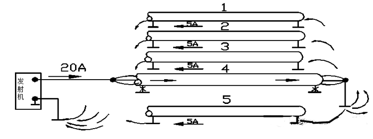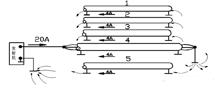由于電纜屏蔽層通常與地相連,如果電纜束中,其它電纜也接到公共地上,發(fā)生器上黑色輸出插孔可連到公共地上,返回電流在幾根電纜屏蔽層進行分配,將返回電流分成許多支流,意味著被識別電纜的差值電流較大,有用信號較清楚,“差值”的意思是輸出電流和其分得的返回電流在同一通道內(nèi)。如圖4所示,圖4中有5根電纜,4號電纜是我們需要識別的,要識別的電纜中“輸出電流”為20A。假設(shè)返回電流在所有電纜的屏蔽層中平均分配,在要測的電纜中應(yīng)有4A的返回電流,要識別的電纜中的差值為:20A(輸出)-4A(返回)=16A(差值)